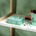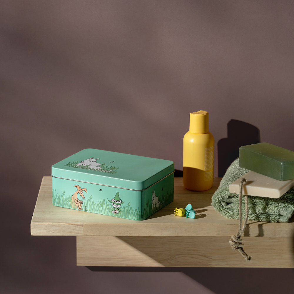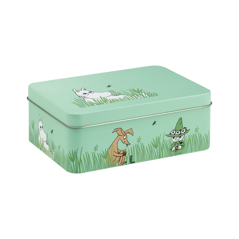 Die Muurla Jungs-Blechdose lädt dazu ein, einen entspannten Sommertag ganz im Stil des Mumintals zu verbringen. Der sanfte Grünton und die stimmungsvolle Illustration sind von Muminmammas blühendem Garten inspiriert, in dem Mumintroll, Snufkin und Sniff die Zeit auf dem weichen Rasen genießen. Diese rechteckige Dose ist mit einem dicht schließenden Deckel ausgestattet, was sie zu einem hervorragenden Aufbewahrungsort für Kekse und Süßigkeiten sowie für Bastelutensilien oder andere kleine Schätze im Haushalt macht. Sie ist ein praktisches und schönes Detail, das sommerliche Leichtigkeit in Ihre Einrichtung bringt.
